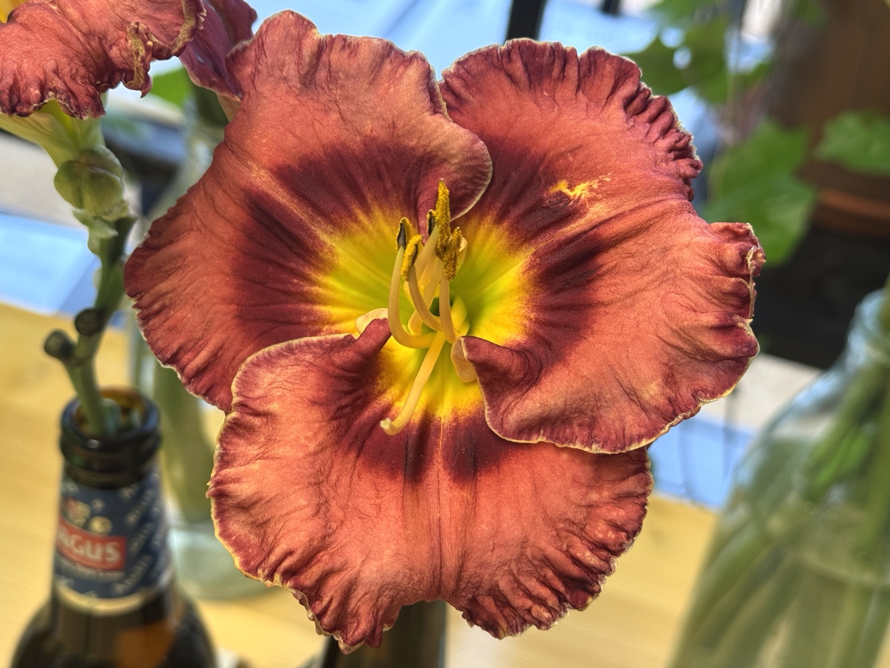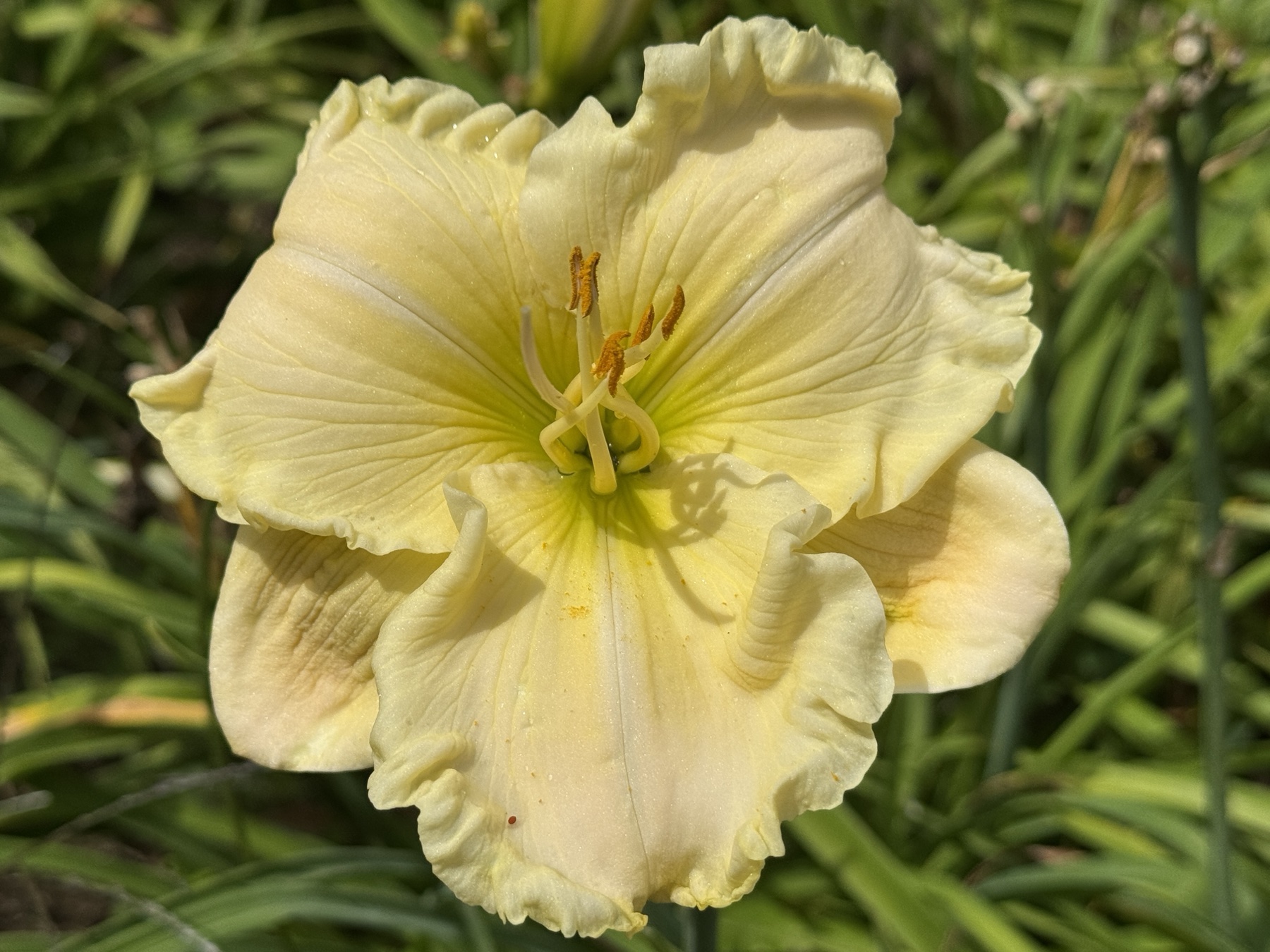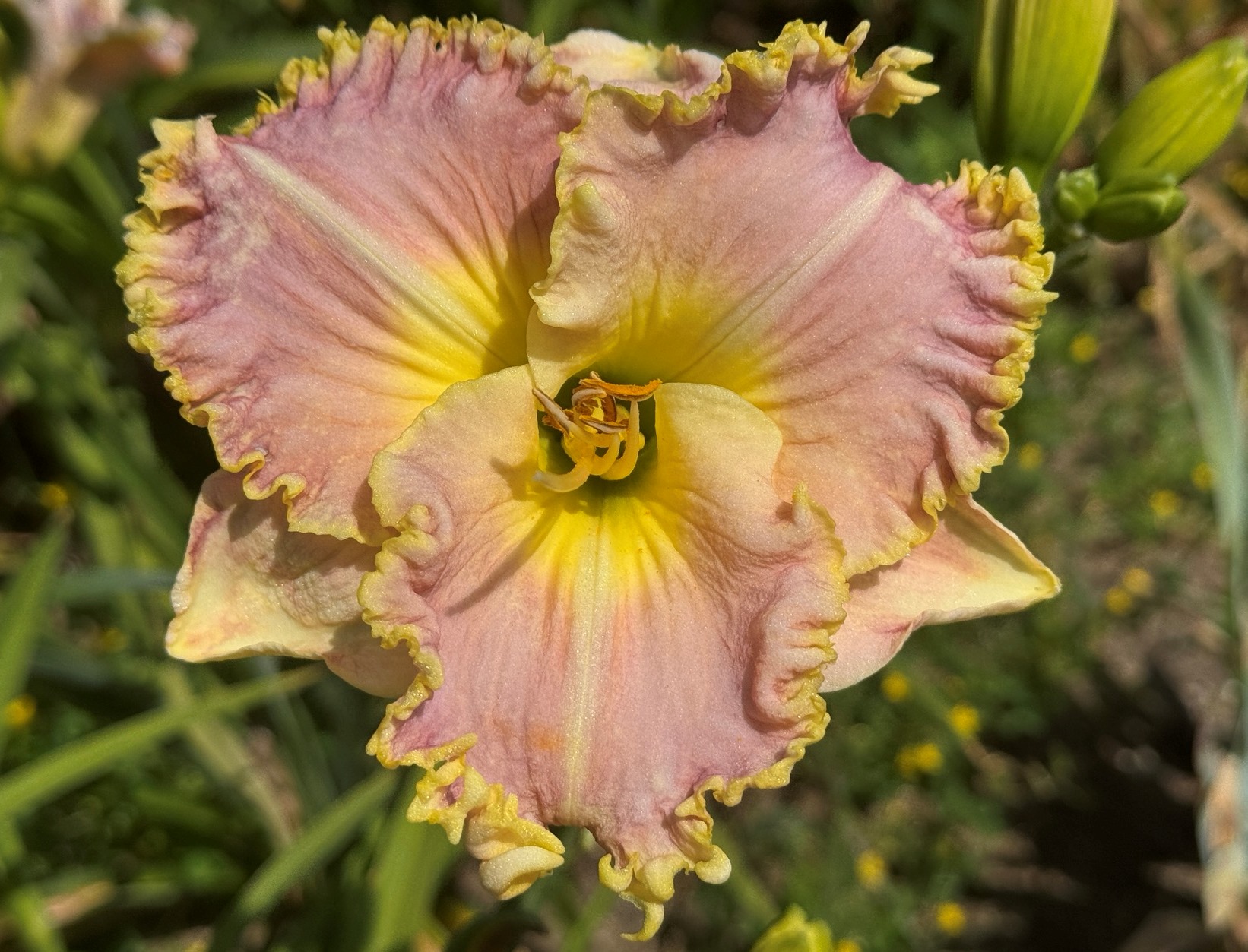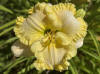zeleně žluté hrdlo, nařasené okraje silně krémově lemované se zelinkavým