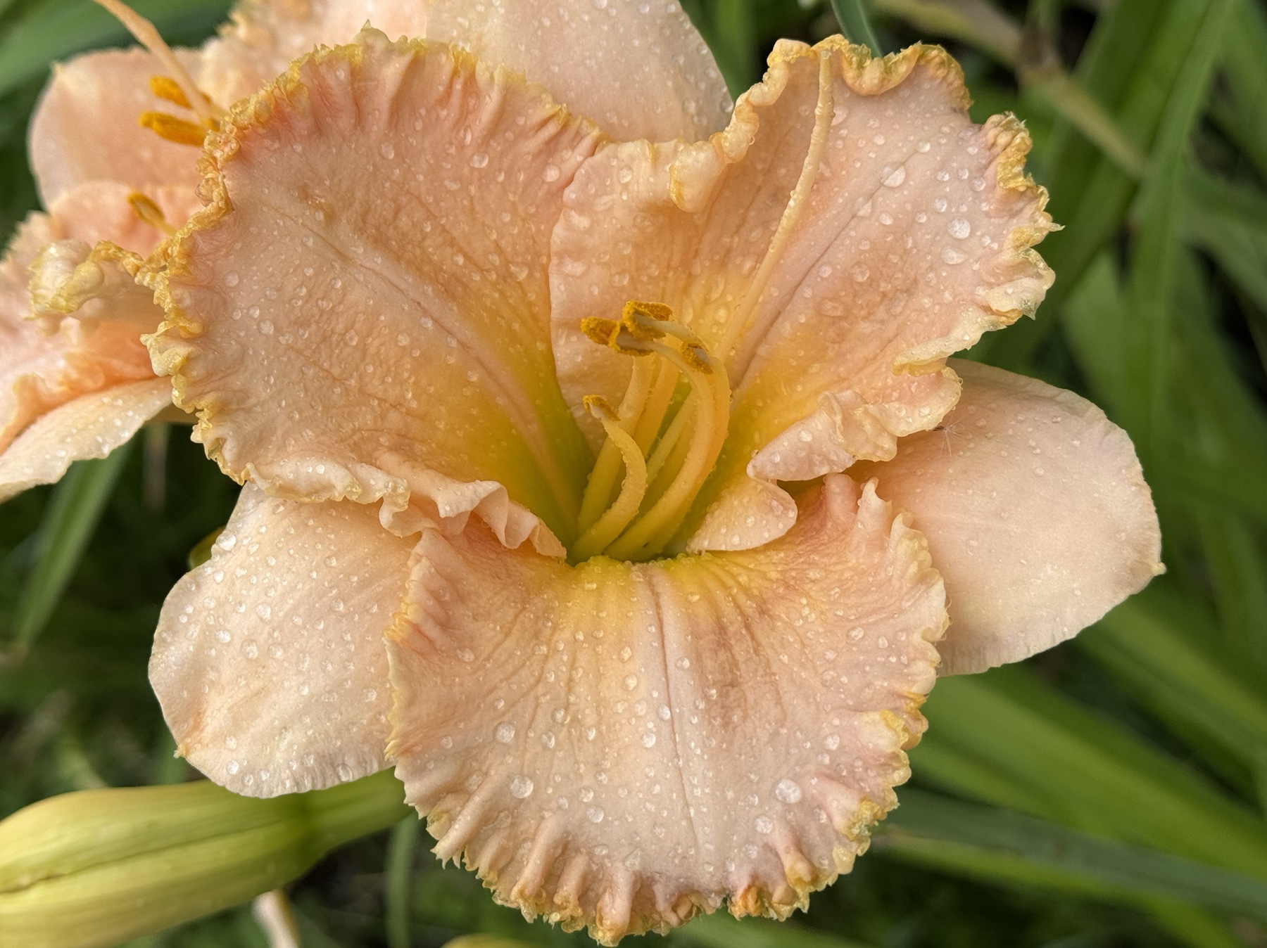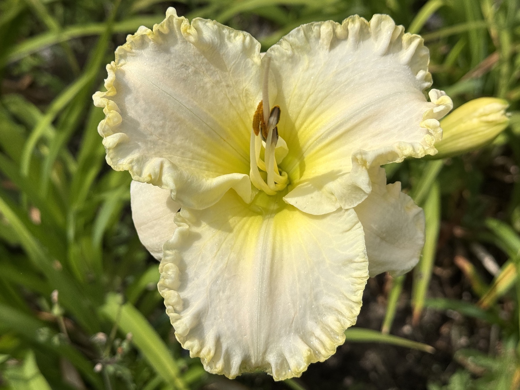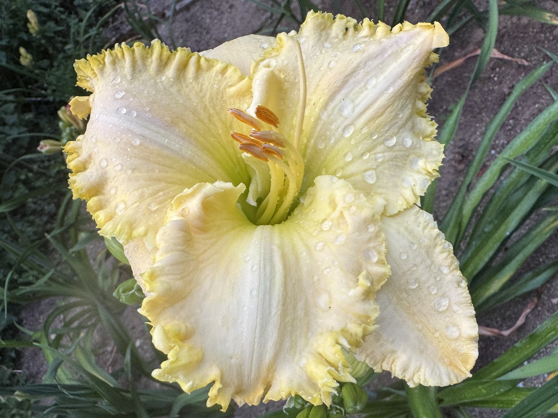 zeleně žluté hrdlo, nařasené okraje silně krémově lemované se zelinkavým