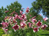 krémové květy, z více jak poloviny překryté sytě purpurovou, v hrdle a u