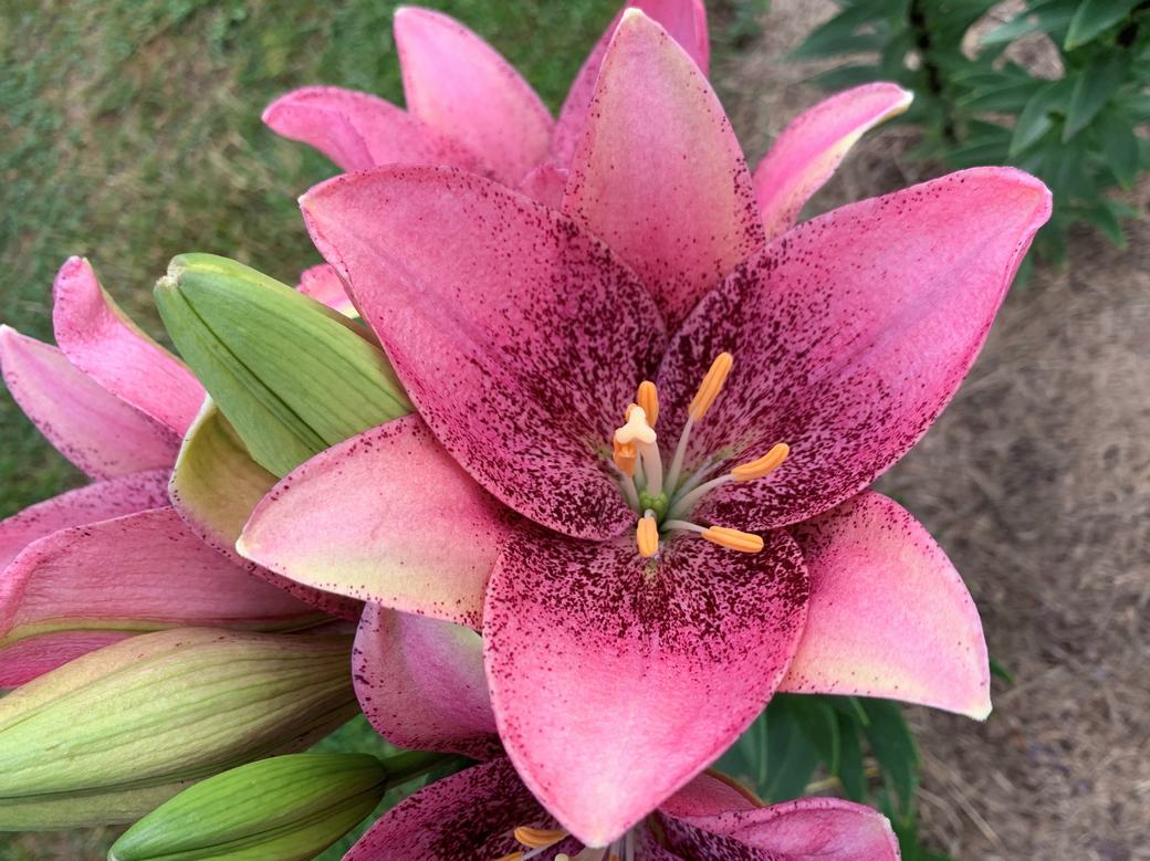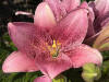 Asijský hybrid s turbánkovými květy sytě růžovými, které jsou bohatě